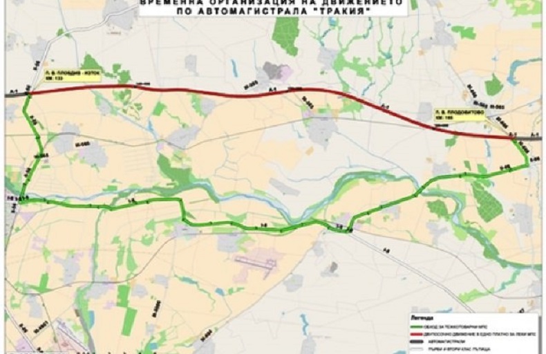 Първоначално ще се работи в платното в посока Бургас, като движението на леките автомобили ще бъде прехвърлено двупосочно в платното за София. Тежкотоварните превозни средства ще се пренасочват по обходен маршрут: от пътен възел „Пловдив Изток" при 133-ти км на АМ „Тракия" по път I-8 и II-66 до пътен възел „Плодовитово" при 165-ти км и обратно.