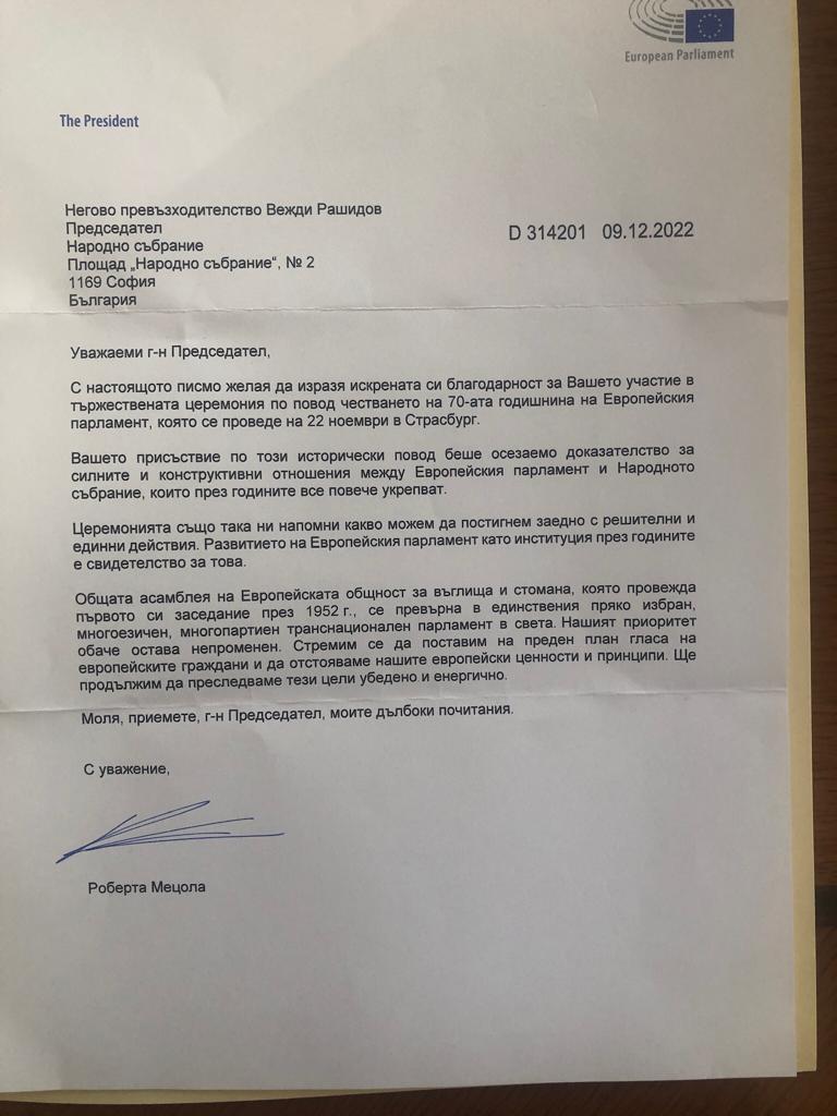 председателят на Европейския парламент Роберта Мецола изпрати благодарствено писмо до председателя на Народното събрание Вежди Рашидов по повод участието му в церемонията за 70-годишнината на Европейския парламент, която се проведе миналия месец в Страсбург.