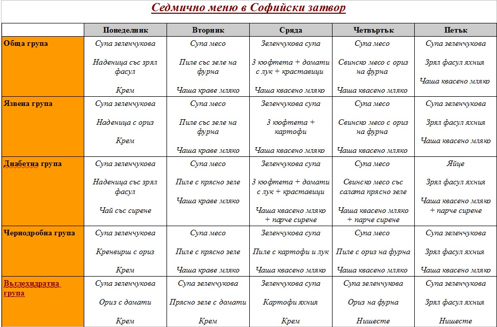Всяка порция за затворниците е около 300 грама само десертът е 150 г. Хлябът пък е на корем, като насъщният се поставя в общ панер, от който всеки лишен от свобода сам си взема колкото иска. От седмичното меню се вижда още, че изцяло постно е само менюто в петък. Не така розово е положението в лечебниците у нас.