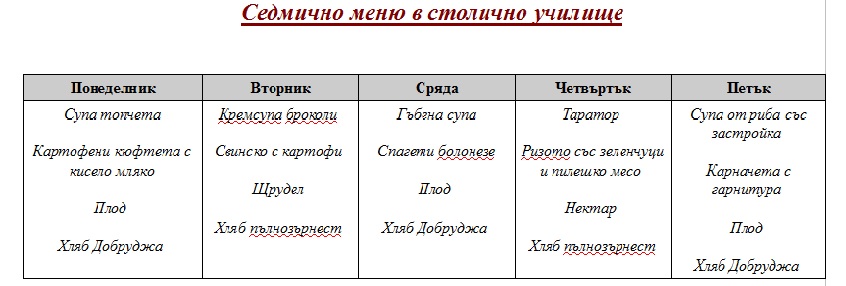 В стола на държавните училища в София пък храната се плаща от родителите и обичайно стойността му е около 3 лв. Менюто всеки ден се състои от супа, основно ястие, десерт и филийка хляб. Заради COVID мерките вече в стойността се добавя и цената на опаковките, тъй като в повечето случаи децата получават храната в училищната си стая и се хранят там, за да не се смесват с други паралелки.