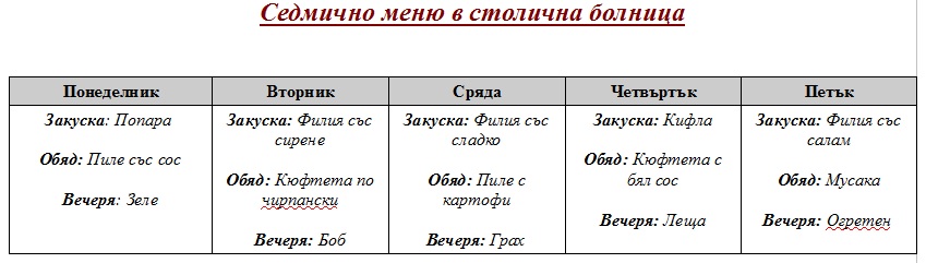 Проверка  в столична болница показа, че там пациентите за цял ден получават също три пъти храна, но тя не е толкова богата като при затворниците. Сутрин болните получават кифла или попара, на обяд имат едно основно ястие, което е задължително с месо, а вечер – още едно ястие, но задължително постно. Хлябът е по 1 филия с обяда и вечерята. Разнообразие в менюто, съобразено със здравословните проблеми на пациентите, няма. Ако някой не може да яде определени храни, просто разчита на кетеринг от близки и роднини. По информация на „Монитор“ подобна е ситуацията почти във всички лечебни заведения у нас, като рядко се случва на места да се изготвят отделни менюта, съобразени със здравословното състояние на пациентите.