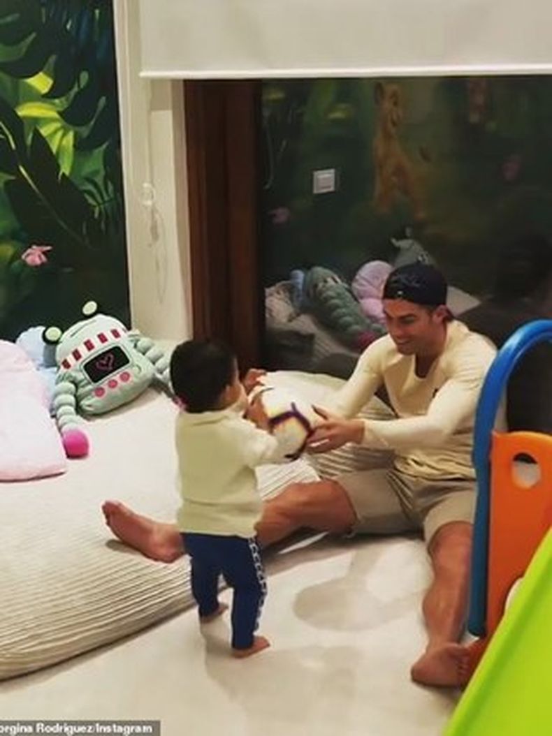 Клип на Джорджина Родригес в Instagram показва как футболистът на „Ювентус“ подава топката на 20-месечния Матео, а той му я връща с ритник. Роналдо е седнал на земята в детската и разтворил краката, които използва за врата. След като детенцето вкарва топката, той го поздравява с думата „гооол“.