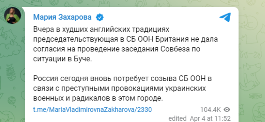 В понеделник Русия отново ще поиска свикване на заседание на Съвета за сигурност на ООН във връзка с престъпните провокации на украинските военни в Буча. Това написа в канала си в Telegram официалният представител на руското външно министерство Мария Захарова.