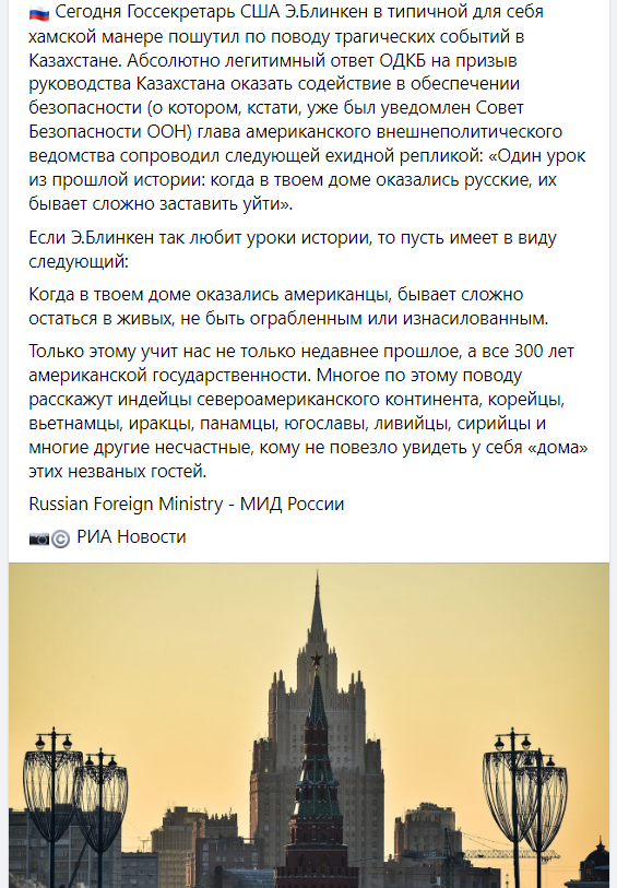 „Държавният секретар на САЩ Антъни Блинкен по типичния за него просташки начин се пошегува относно трагичните събития в Казахстан. Абсолютно легитимния отговор на ОДКС на молбата на ръководството на Казахстан за съдействие в осигуряване на безопасност (за която, между другото, вече беше уведомен Съветът за сигурност на ООН) главата на американското външнополитическо ведомство коментира със следната ехидна реплика: "Един урок от най-новата история е, че когато руснаците влязат в дома ви, понякога е много трудно да ги накарате да си тръгнат", се казва в информацията на посолството на Москва в България.