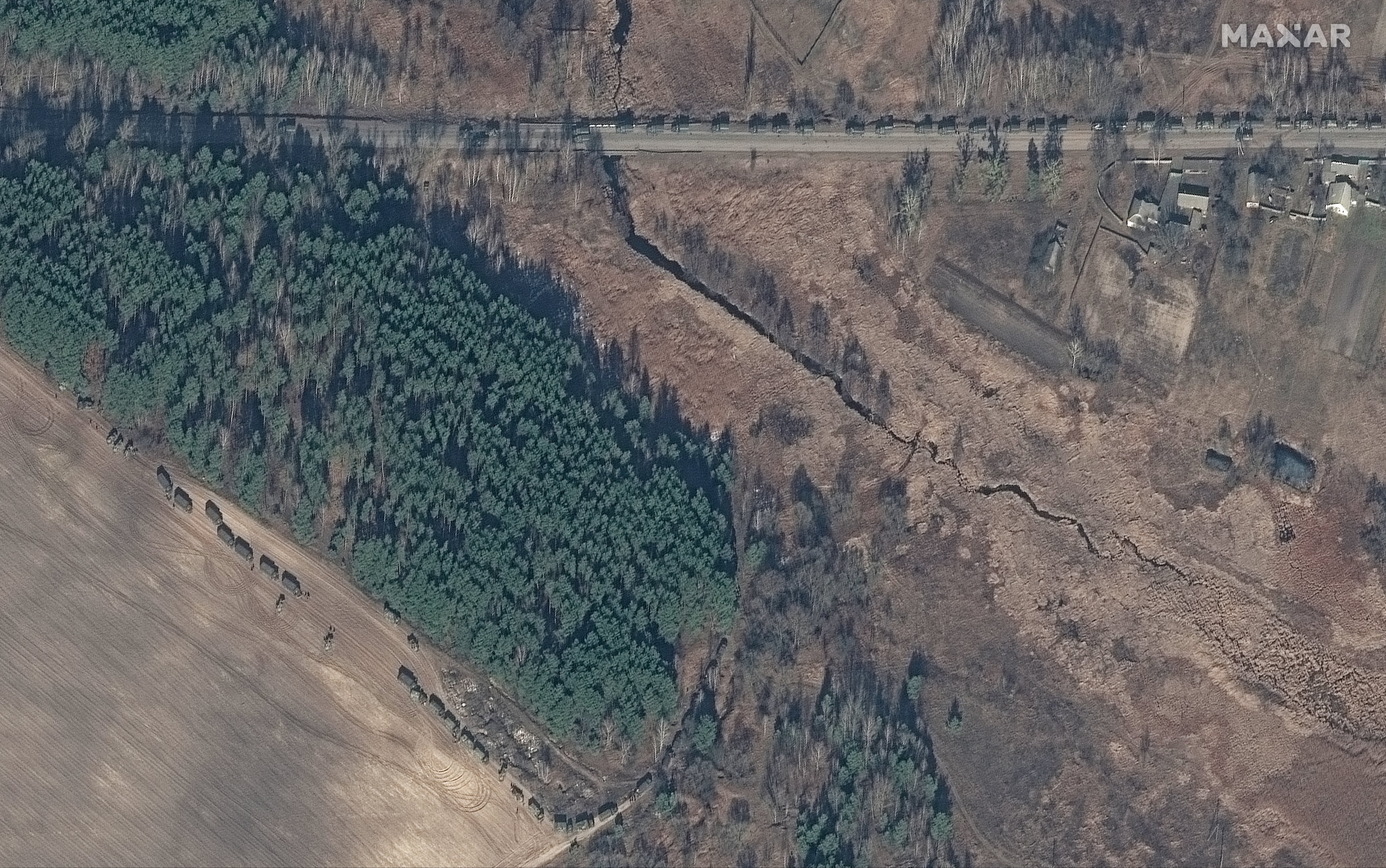 От изображенията на Maxar Technologies, направени в неделя, се вижда разполагане на руски сухопътни сили, включващо стотици военни превозни средства, които се насочват североизточно от украинския град Иванков и се движат в посока Киев, съобщава "Труд".