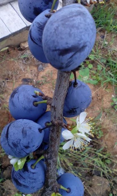 Дръвчето е млада японска синя слива и е отрупано с плодове, но необичайното в случая е, че до тях са се появили цветове и нови филизи.