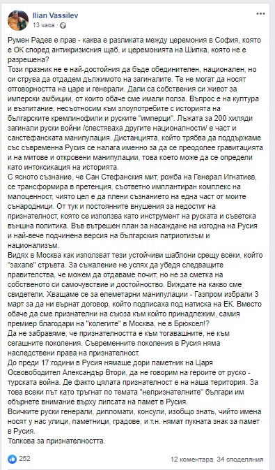 Срещу критиките, че за поредна година Радев не е почел на 1 февруари жертвите на комунизма агентът за влияние написа във Фейсбук, че президентът отдавал почит на жертвите на 2 февруари, защото не искал да бъде част от общата масовка. Агент „Сашо” мълчи за участието на Румен Радев на 9 май на парада на Червения площад, дума не обели и за сватбарския маскарад, който организираха с БСП в деня на обесването на Васил Левски. Но Василев е много активен и хвали Радев за „мафията“.