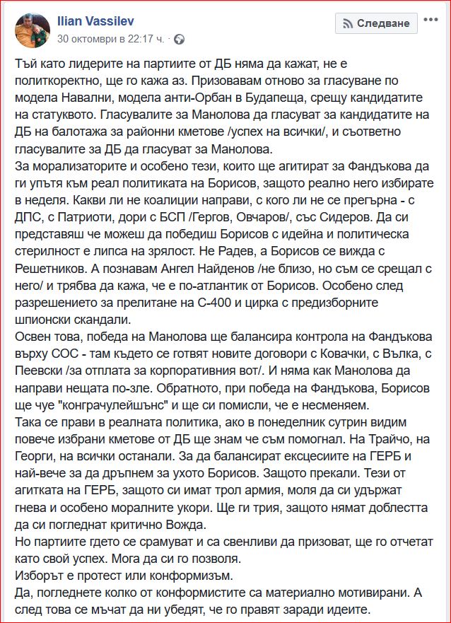 Кръгове около Илиян Василев твърдят, че „компетентният” по всички въпроси „анализатор” бил отрязан от грантове и проекти. Участието му и в съмнителния и поръчков „Антикорупционен фонд”, контролиран от кръга „Капитал”, също не носел хонорари, след като официално обявили, че събират помощи от гражданите. Сега апетитът му за финансиране бил свързан с „Дондуков” 2 и надеждите, че Радев ще състави служебно правителство.