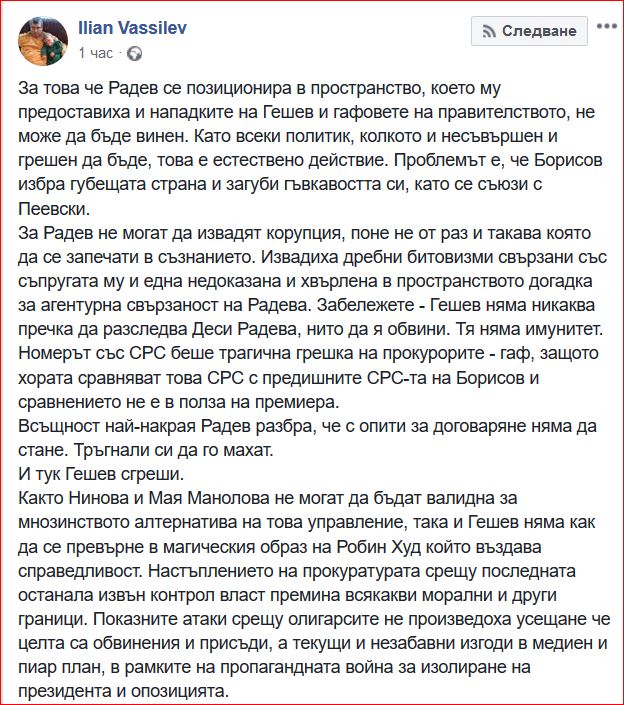 Агентът на ДС с псевдоним „Сашо” уж беше едно от остриетата срещу Румен Радев и БСП по време на кандидат-президентската кампания, а и през следващите три години. Именно Илиян Василев представяше Румен Радев като продукт на Леонид Решетников и руските специални служби. Днес обаче агентинът „Сашо“ се е заел с лъскане имиджа на Румен Радев дори и с абсурдни и измислени тези, които се посрещат с насмешка и ирония в социалните мрежи.