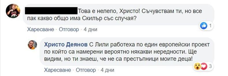 Синът му Александър Деянов-Скилър също бе сред арестуваните миналия уикенд, но в последствие бе освободен срещу гаранция от 100 хил. лева. По думите на бащата нито той, нито музикантът някога да се срещали очи в очи с Васил Божков. Това обаче не важи за Лилана, за която разследващите смятат, че е поставено лице на милионера.