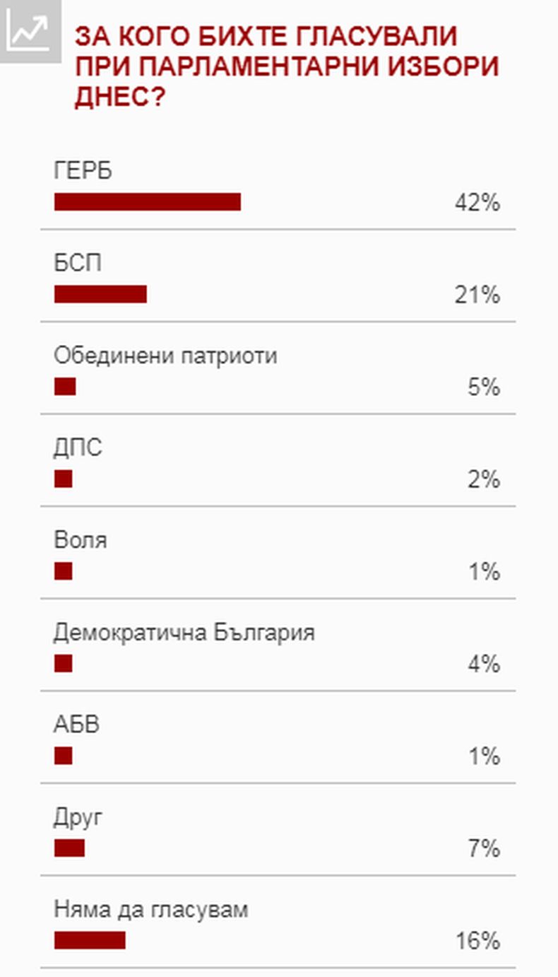 На въпрос "ЗА КОГО БИХТЕ ГЛАСУВАЛИ ПРИ ПАРЛАМЕНТАРНИ ИЗБОРИ ДНЕС?", ГЕРБ води с 42 процента на едва 21 за БСП. Двойно по-голяма е подкрепата за партията на премиера Бойко Борисов, което за пореден път доказва, че тя няма алтернатива, начело на страната.