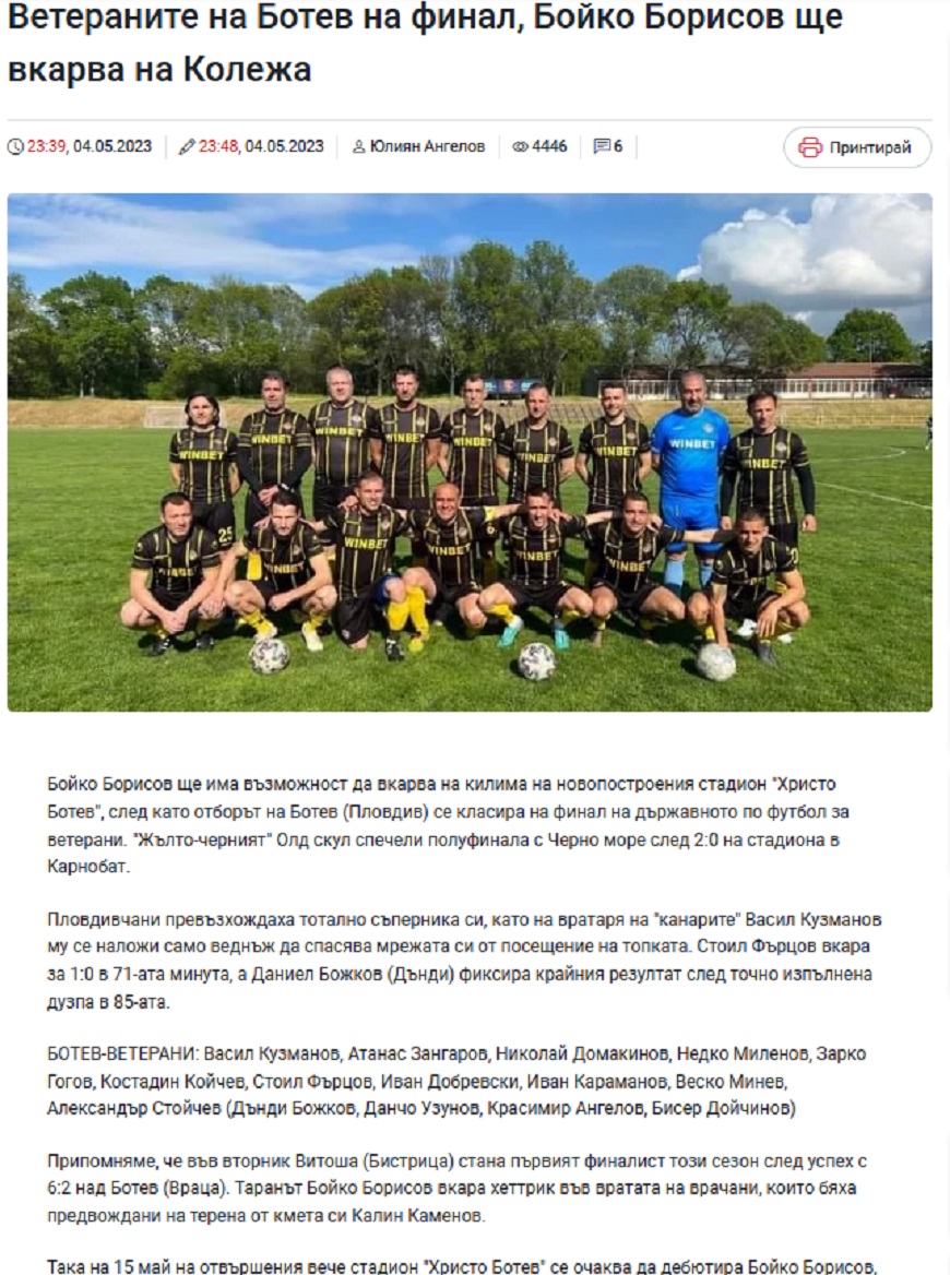 В началото на май Борисов вкара хеттрик на Ботев Враца и така класира Витоша Бистрица на финала, където отборът му трябва да срещне ветераните на Ботев Пловдив. Още тогава бе съобщено, че финалът ще се състои на 15 май и ще се играе на новооткрития стадион "Колежа" в Пловдив.