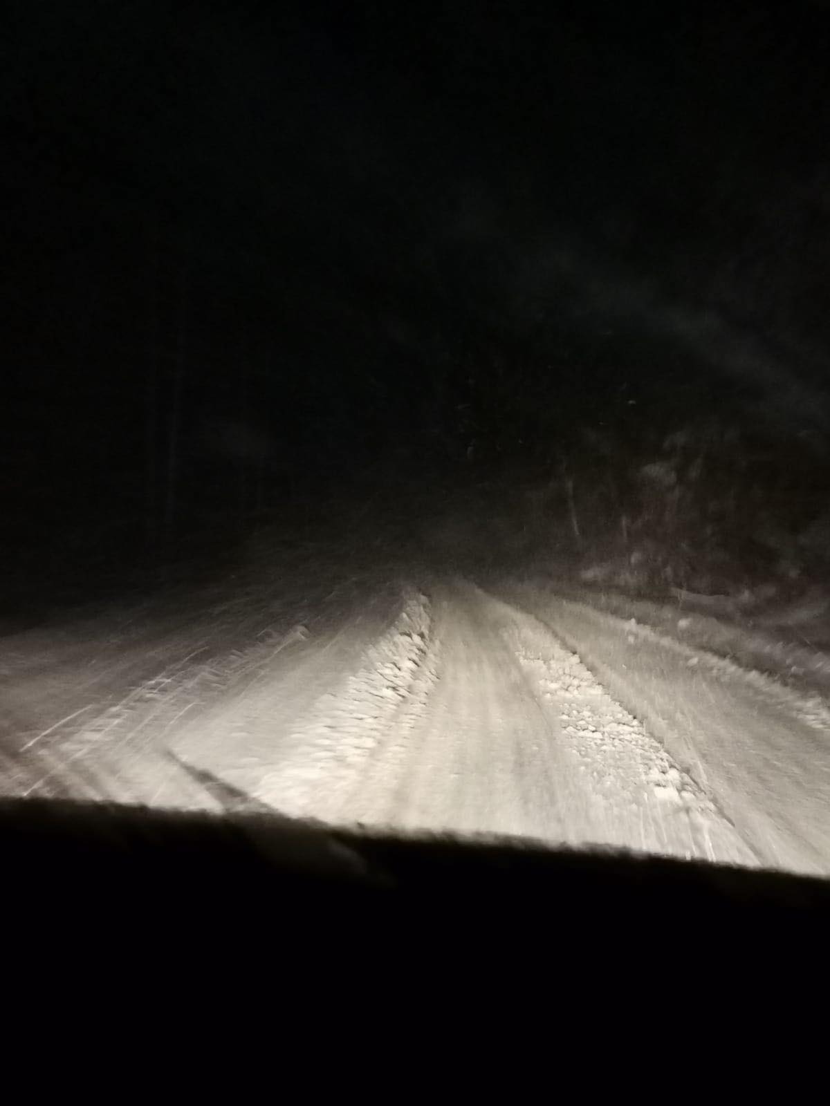Пълна тъмнина цари на пътя. Единствената светлина идва от фаровете на автомобилите. А пътят е хлъзгав и снежен, въобще не личи по него да е минавал снегорин.