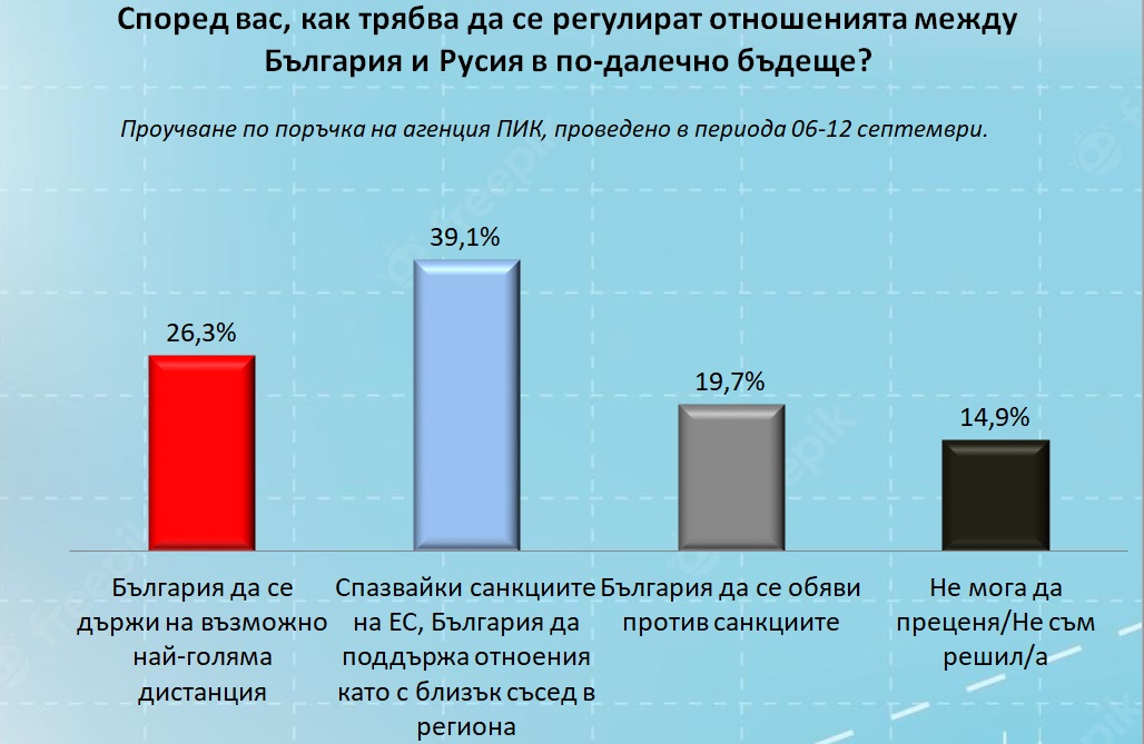 39,1% искат да се спазват санкциите на ЕС, но страната ни да поддържа отношения с РУсия като с близък съсед в региона. 19,7% са против санкциите, а 26,3% настояват да държим възможно най-голяма дистанция. Обобщено, тези резултати показват, че почти 60% от хората в страната искат да запазим добри отношения с Русия в по-далечно бъдеще.
