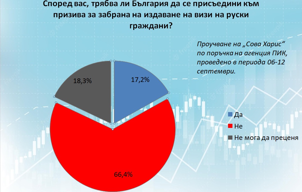 2/3 от българите не искат страната ни да се присъединява към призива за забрана на издаване на визи на руски граждани. Само 17,2% подкрепят такава санкция.