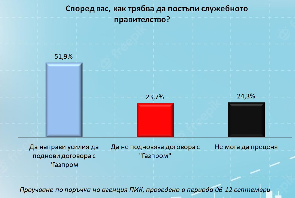 51,9% от българите са на мнение, че доставките на газ трябва да бъдат възобновени, а едва 23,7% смятат, че дейността по договора не трябва да се подновява. 24,3% не взимат отношение по темата.