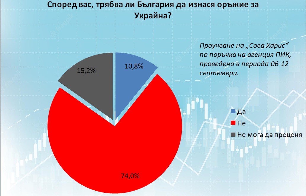 Още по категорични са процентите, що се отнася до въпроса дали България трябва да изнася оръжие за Украйна. 74% са против, а едва 10,8% са за подобни действия.