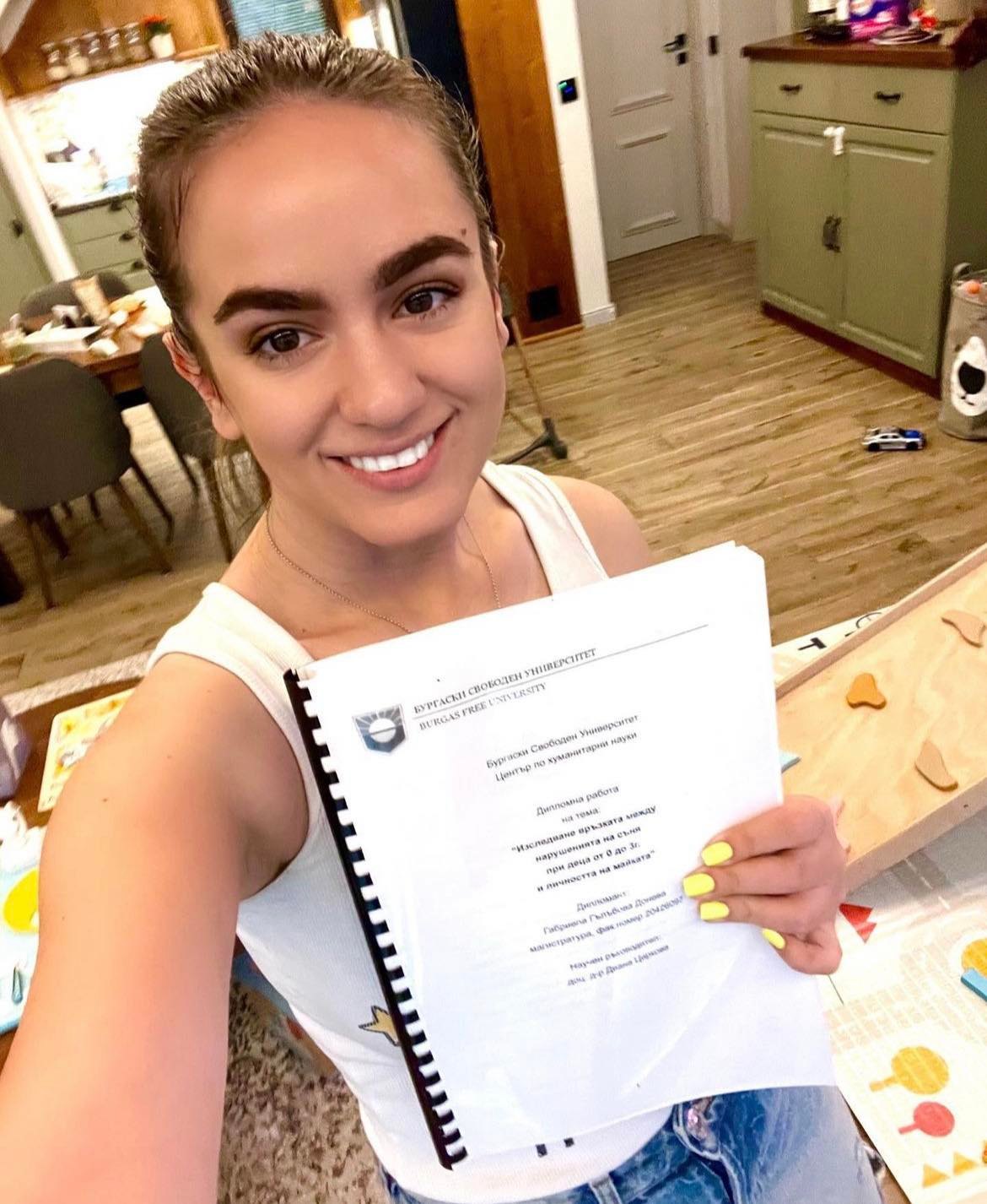 „В последните месеци все ме няма, а причината за това е дипломната ми работа за магистратурата ми по "Детска и юношеска психология”, сподели наследничката на министър-председателя пред последователите си в социалните мрежи. - Започнах това образование, преди да се роди Роби, дори преди да съм бременна. Преди почти 3 години взех решение, че искам освен човек на изкуството да развия и психологическата страна на работата си. Сега вече това е факт. Беше ми изключително трудно, признавам, да бъда майка 24/7 и да намеря времето за изпит всяка втора събота в последните 2 години и половина. Дипломната ми работа от 96 страници вече е факт, а дипломата ми съвсем скоро ще се присъедини към всички останали. Гордея се със себе си и усилията, които положих, въпреки липсата на време и изтощението с малко бебе”, допълва Габриела.