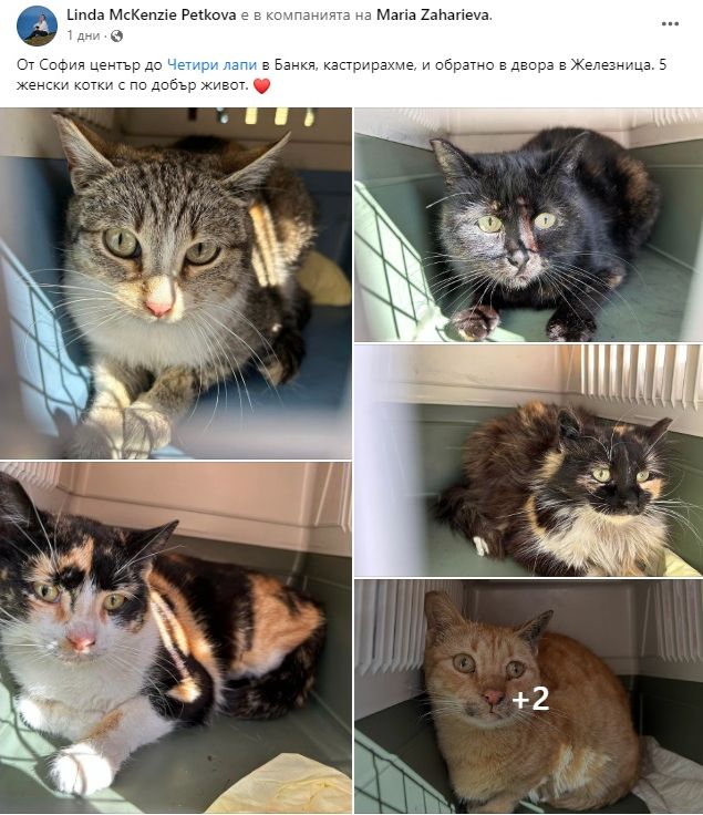 "От София център до "Четири лапи" в Банкя, кастрирахме, и обратно в двора в Железница. 5 женски котки с по-добър живот", отбеляза Линда Петков към снимки на преминалите през ветеринарната клиника мъркащи животинки.