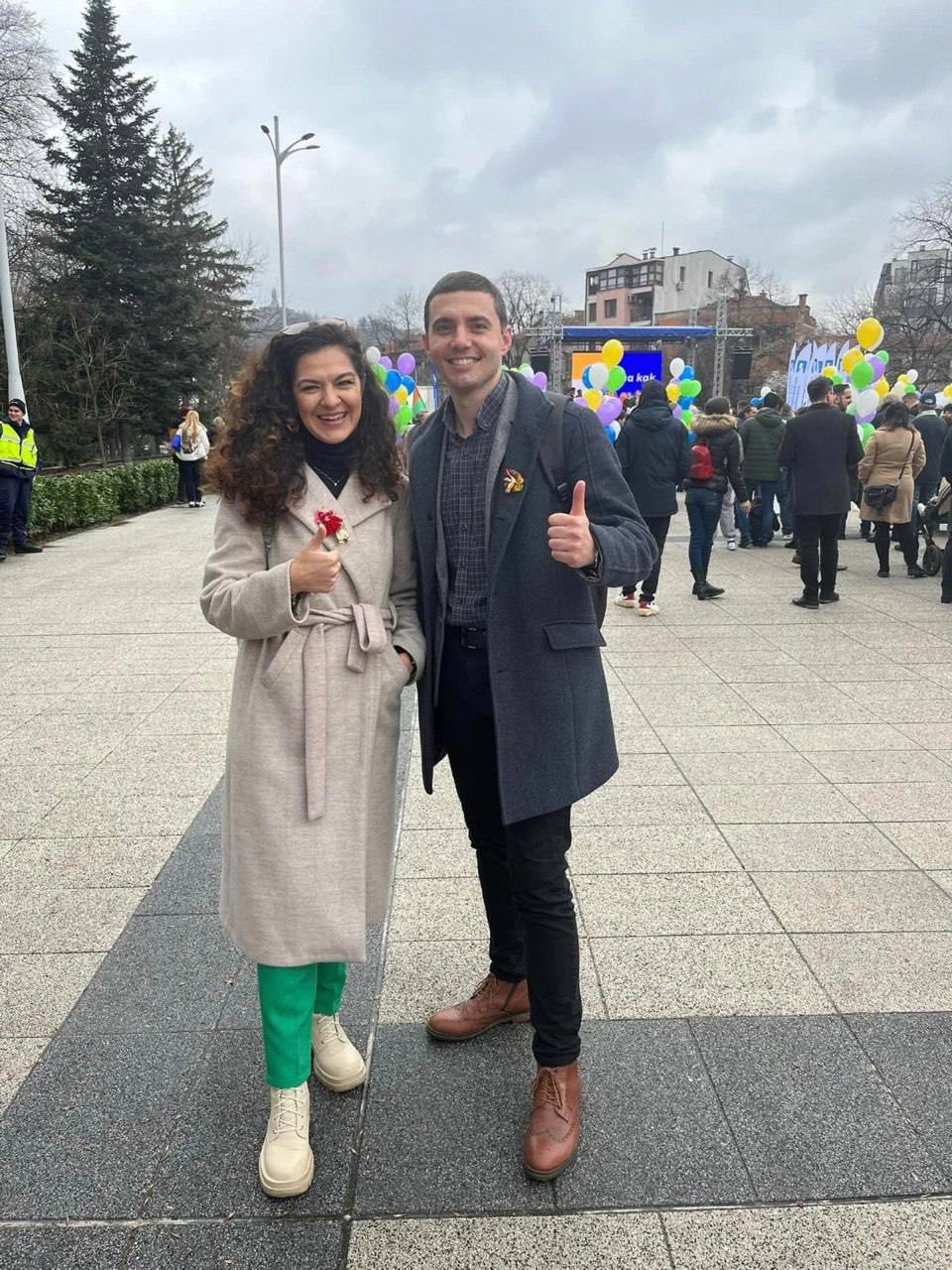 Кандидат-кметът от ППДБ Искрен Арабаджиев позира заедно с кандидатката за общинска съветничка Ирен Кривошиева-Досева. Мъжът й, който е полицай, е забелязан да пази предизборните мероприятия на Арабаджиев.