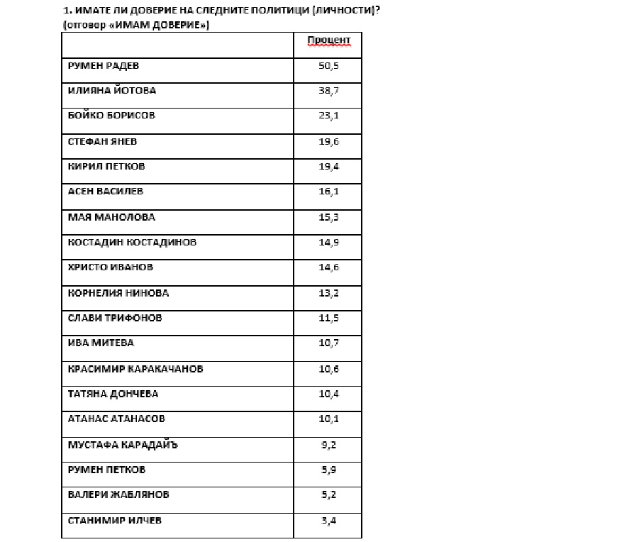 С най-голямо доверие сред политическите личности е Румен Радев - 50,5%. Зад него се нарежда вицепрезидентът Илияна Йотова с 38,7%.