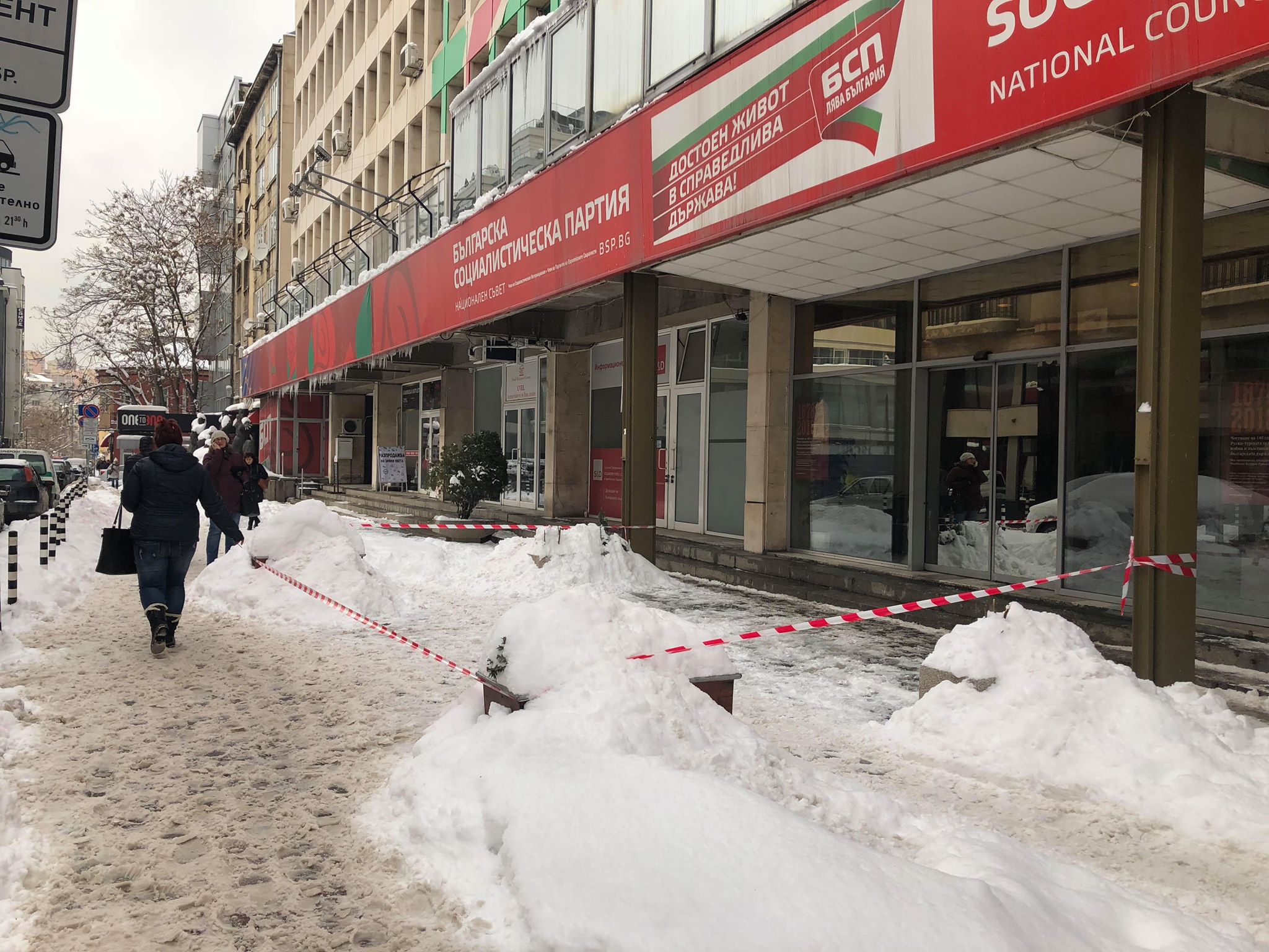 Ръководството на БСП обаче вместо да вземе мерки за почистването им, каквото задължение има всеки собственик на сграда, е решило да избегне правилата. От "Позитано" 20 просто за заградили входа на сградата с обозночителна лента, за да не се преминава под опасните висулки и явно нямат никакво намерение да ги премахнат.