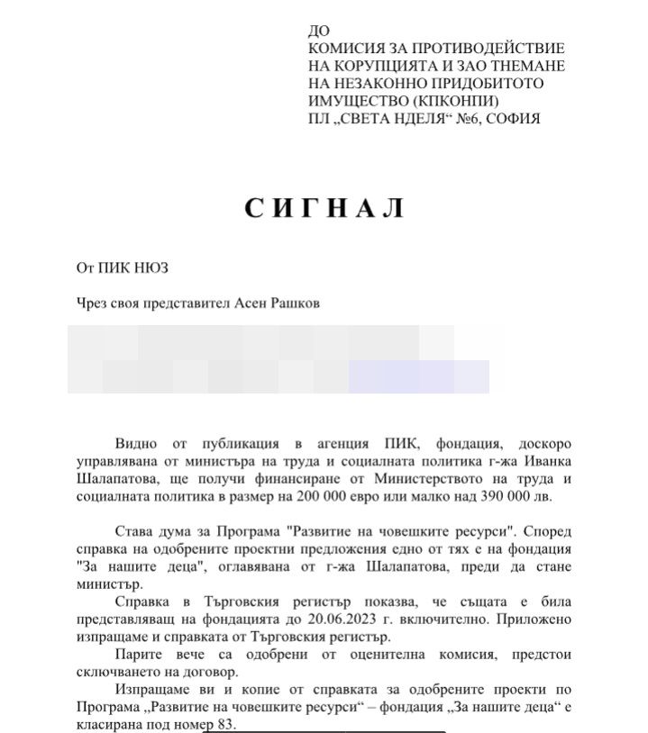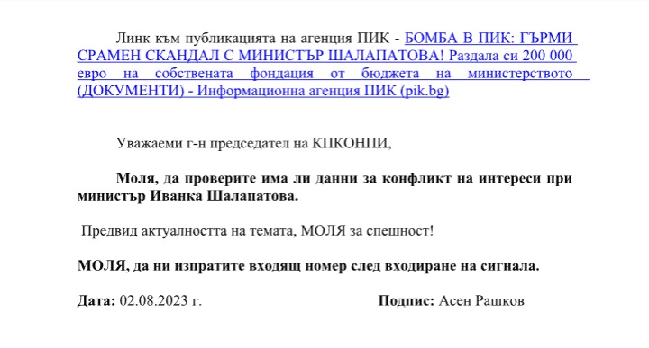 САМО В ПИК! Сигнал до КПКОНПИ за конфликт на интереси при министърката Шалапатова заради едни 400 бона (ДОКУМЕНТ)