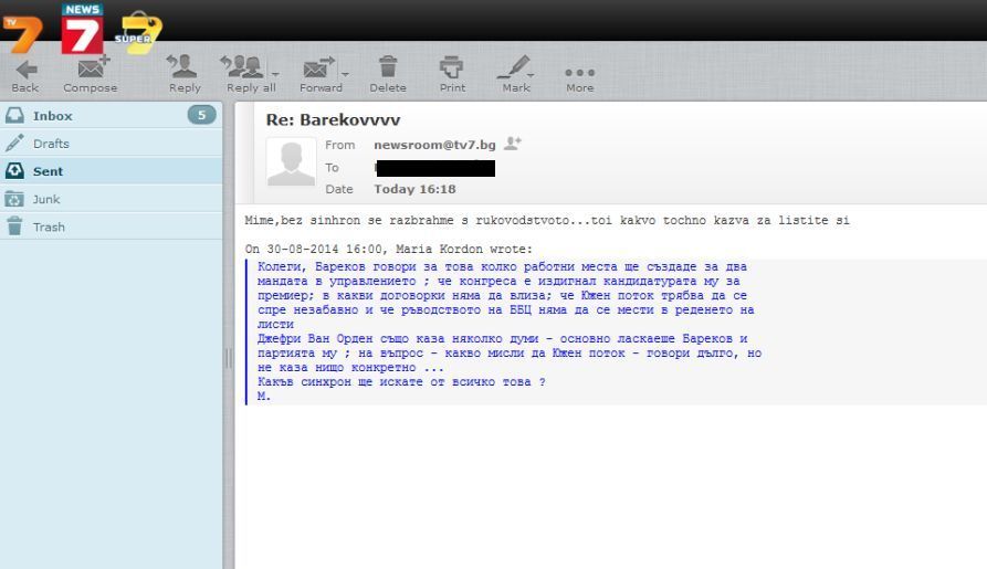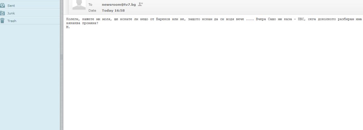 Следва мейл от редакторите на новините, в който се съобщава, че след разговор с ръководството е взето решение „синхрони“ на Бареков да не се излъчват.