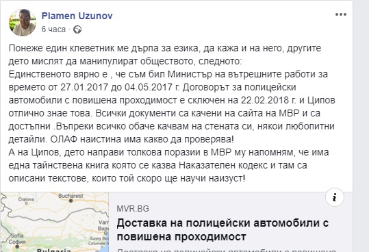 "А на Ципов, дето направи толкова поразии в МВР му напомням, че има една тайнствена книга която се казва Наказателен кодекс и там са описани текстове, които той скоро ще научи наизуст!", бе написал Узунов във фейсбук профила си, без да крие язвителния тон и явната заплаха.