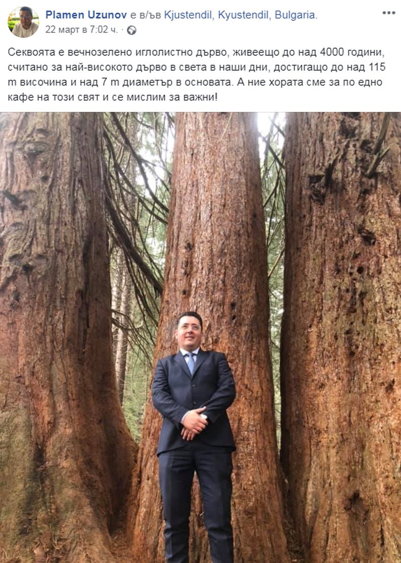 Постът на Пламен Узунов, който той надлежно премахна от профила си, само няколко дни след разкрититето на медията ни. С днешна дата стои единствено този от Кюстендил, където съветникът на президента се е снимал пред дърво.