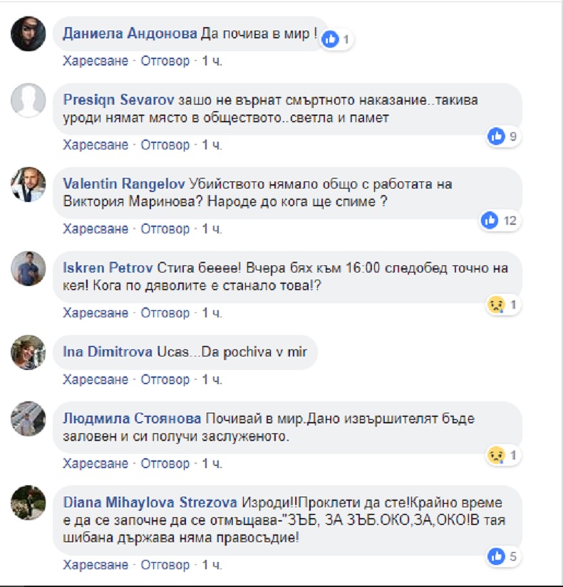 Жестокостта на деянието възмути и приятелите на Виктория Маринова във Фейсбук. Част от тях поискаха връщане на смъртното наказание, а други - отмъщение.