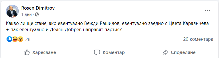"Делян Добрев да се поучи от колегата си Вежди Рашидов. И той ненавиждаше шарлатаните, и той търпеше, и той роптаеше с полууста, но накрая Борисов му сапуниса въжето. За всеки случай. Вежди беше "спяща клетка" на съпротивата, можеше да се активира внезапно. Такъв е случаят и с Делян Добрев - Борисов няма да го бави още дълго", коментира издателят на ПИК по повод поредния критичен пост на Добрев към сглобката, касаещ галопиращите цени на бензина и дизела.