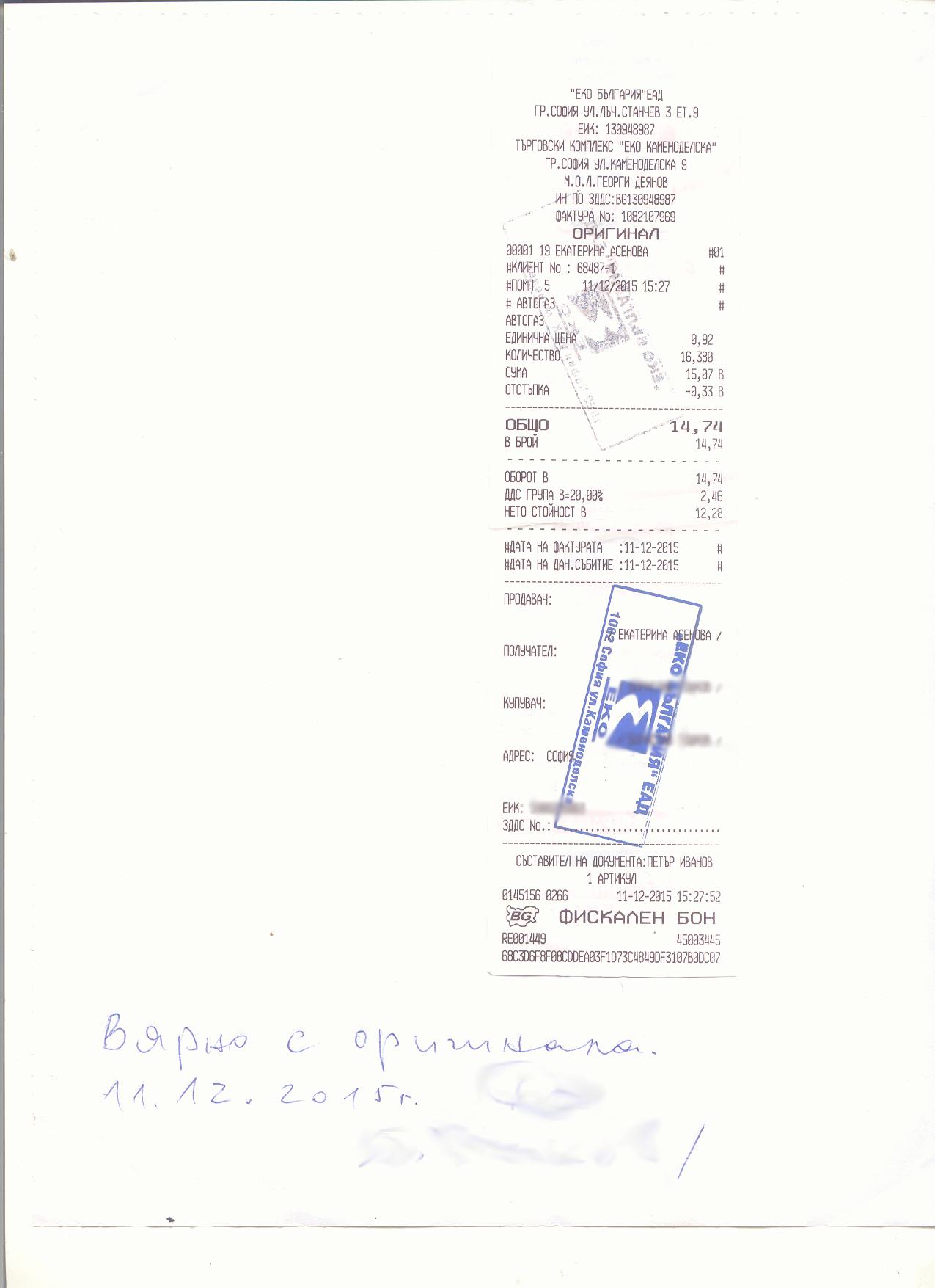 На 11.12.2015г. в 15.27ч. заредих газ пропан-бутан от Търговски комплекс "Еко" на ул. Каменоделска №9 в гр. София. Бутилката е с обем 15 (петнадесет) литра, но на колонката беше отчетено количество 16.38 (шестнадесет) литра и 380 милилитра., което превишава с повече от литър вместимостта на инсталираната бутилка.