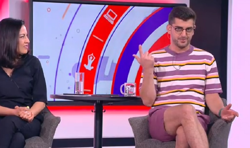 Телевизионният водещ Александър Кадиев се появи със странно облекло по време на днешния ефир на "Преди обед", видя ПИК. Синът на Катето Евро цъфна в националната телевизия Би Ти Ви с тениска и къси шорти, подхождащи повече за домашно облекло, отколкото за телевизионно предавне.
