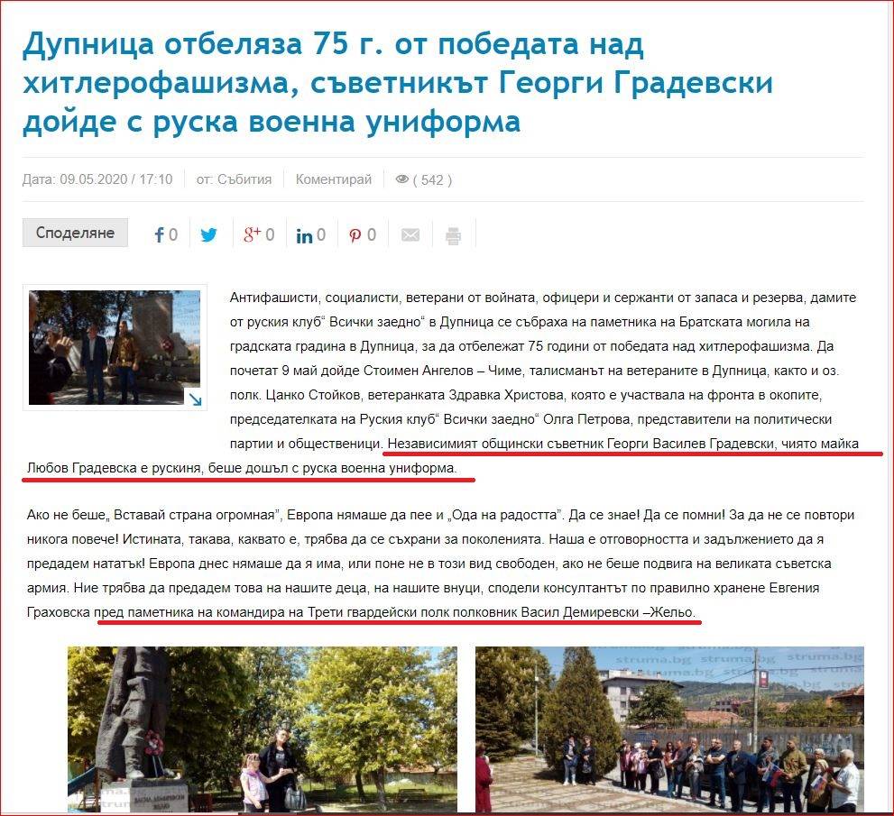 Впоследствие се оказа, че "евроатлантикът" Градевски е силно просъветски настроен, защото на 9 май 2020 г. се появи облечен в съветска военна униформа.