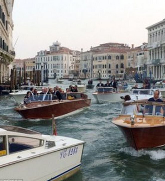 Във Венеция през този уикенд цари лудост. Частната лодка -водно такси с надпис "любов", с която се движат Клуни и Аламудин е "ескортирана" от десетки лодки с папараци или просто любопитни хора. Фенове се надяват да видят знаменитостите и се тълпят на мостовете край площада със седемзвездния хотел "Аман", в който са настанени двойката и техните приятели.