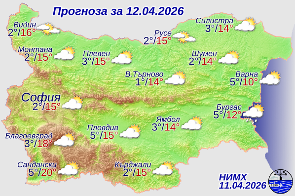 На днешния празничен Великден ще преобладава слънчево време, след обяд с временни увеличения на облачността, но само на отделни места в източните и планинските райони ще превали слаб дъжд. Ще духа слаб вятър от северната четвърт, в Източна България - от изток-югоизток. Минималните температури ще са предимно между 0° и 5°, в София - около 2°. Максималните температури ще са между 13° и 18°, малко по-високи в крайните югозападни райони. В София максималната температура ще е около 15°. Това съобщават от Националния институт по метеорология и хидрология (НИМХ).