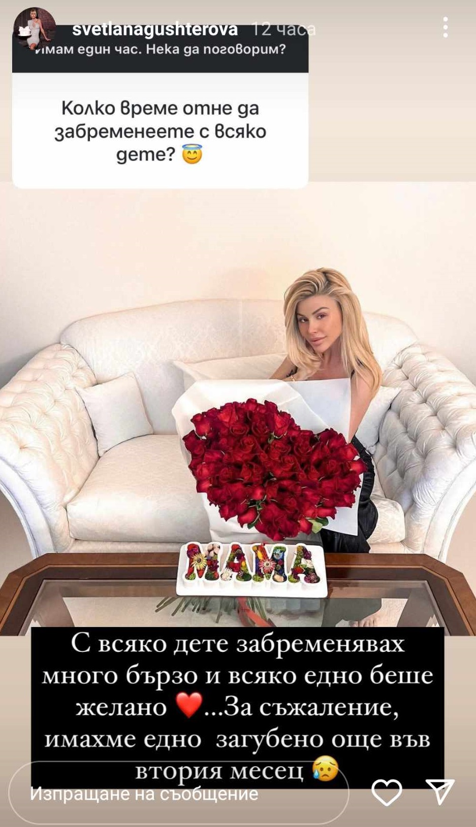 Плеймейтката Светлана Гущерова призна в социалните мрежи, че е загубила дете. В отговор на въпрос от последовател в социалните мрежи милионерската съпруга признава, че с всяко дете е забременяла бързо "и всяко едно беше желано. За съжаление имахме едно загубено още във втория месец", казва тя.