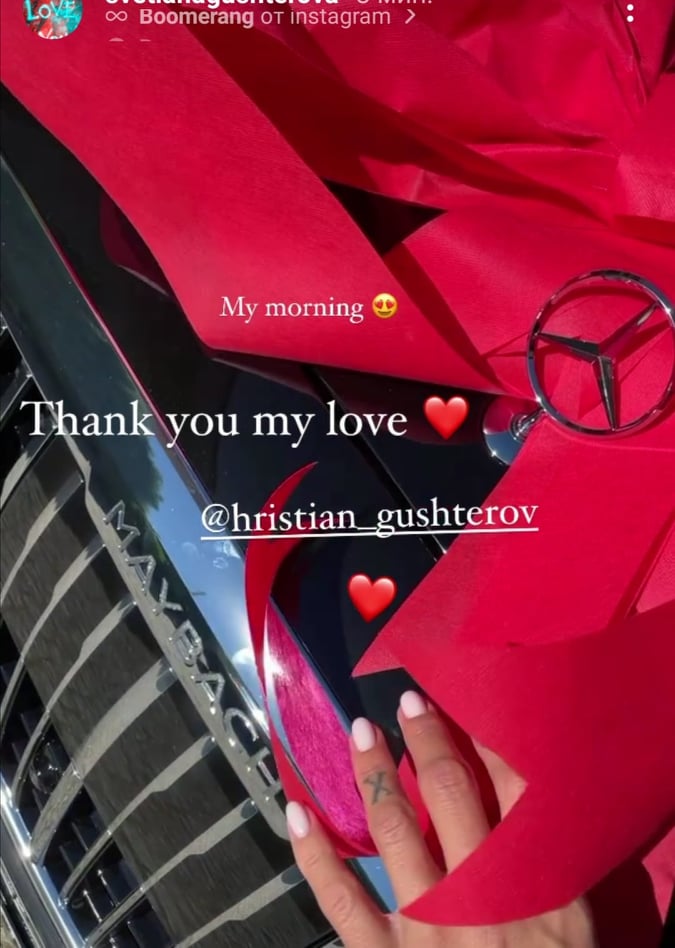 Неотдавна Гущерова качи стори с решетката на черен Майбах с огромна червена панделка, придружено с "Благодаря ти моя любов, Християн Гущеров". Снимката обаче престоя за много кратко в профила й.