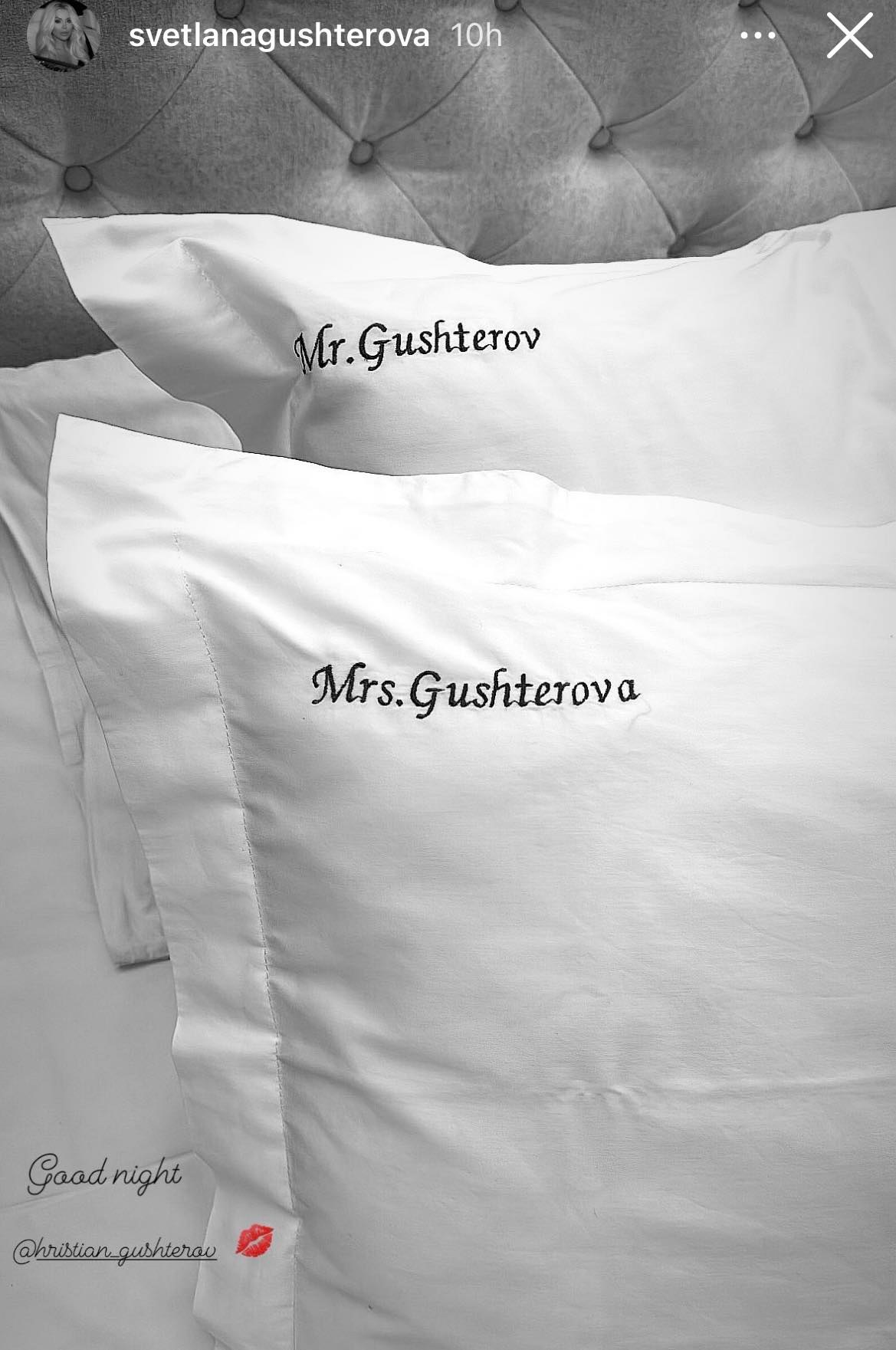 До това заключение онлайн потребителките стигнаха заради две снимки от спалнята на Гущерови. Вижда се, че върху спалното им бельо е строго персонализирани - за Mrs. Gushterova и за Mr. Gushterov, като Mr & Mrs Smith, изиграни от Брад Пит и Анджелина Джоли.