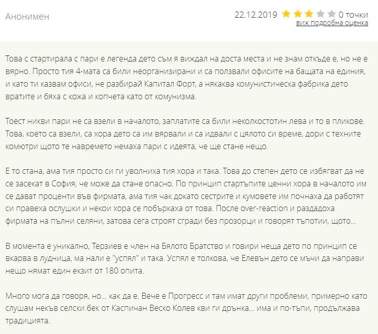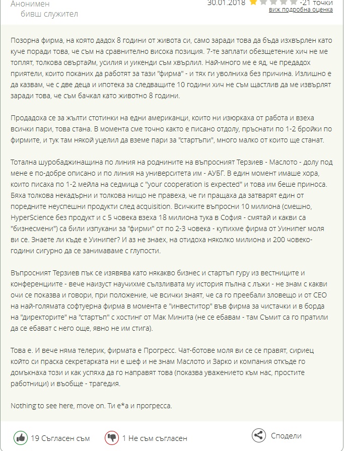 Думите му потвърждават и другите бивши служители на Терзиев, а коментарите за методите му на работа в сайта "БГработодател" са безброй.