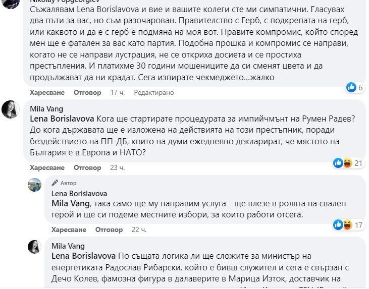 След протеста Бориславова, за която е публична тайна, че е Сивия кардинал в "Продължаваме промяната" бе запитана във Фейсбук кога формацията ще стартира реална процедура за импийчмънта на Радев.