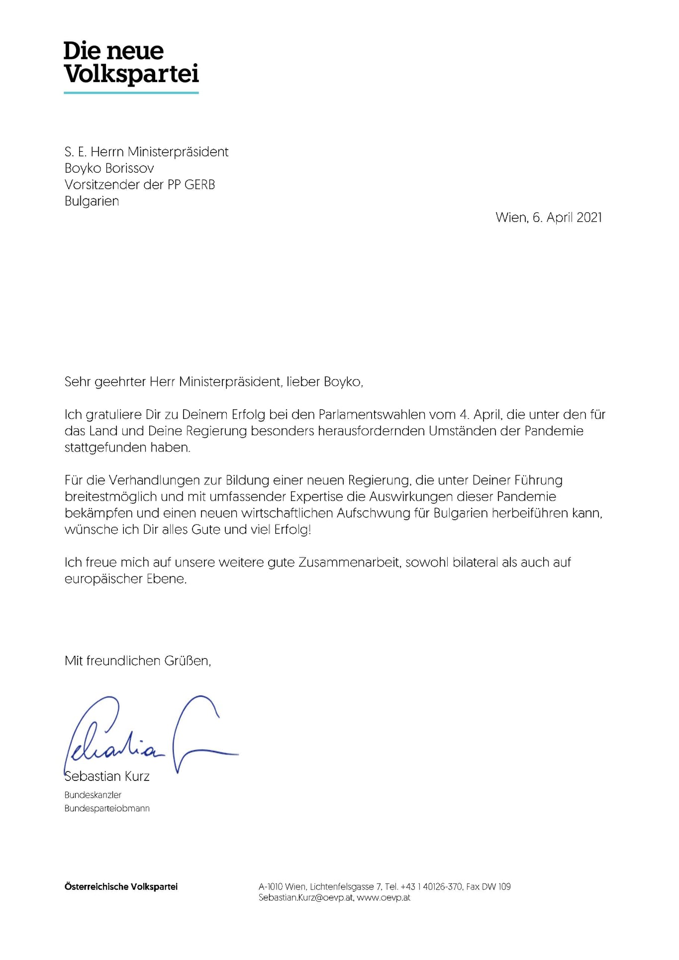 „Желая ти успех при преговорите за сформиране на ново правителство. Под твоето ръководство и благодарение на твоя опит ще е възможно да бъде събрана най-широка експертиза, която да помогне за преодоляване последствията от пандемията и да поведе България отново към икономически растеж“, посочва в своето писмо Курц. В заключение австрийският канцлер благодари на Бойко Борисов за отличното сътрудничество както между двете държави, така и на европейско ниво.
