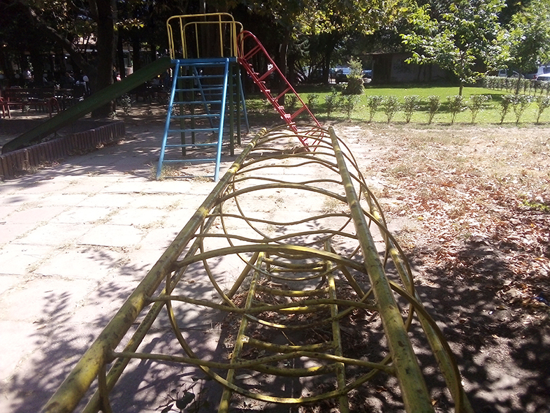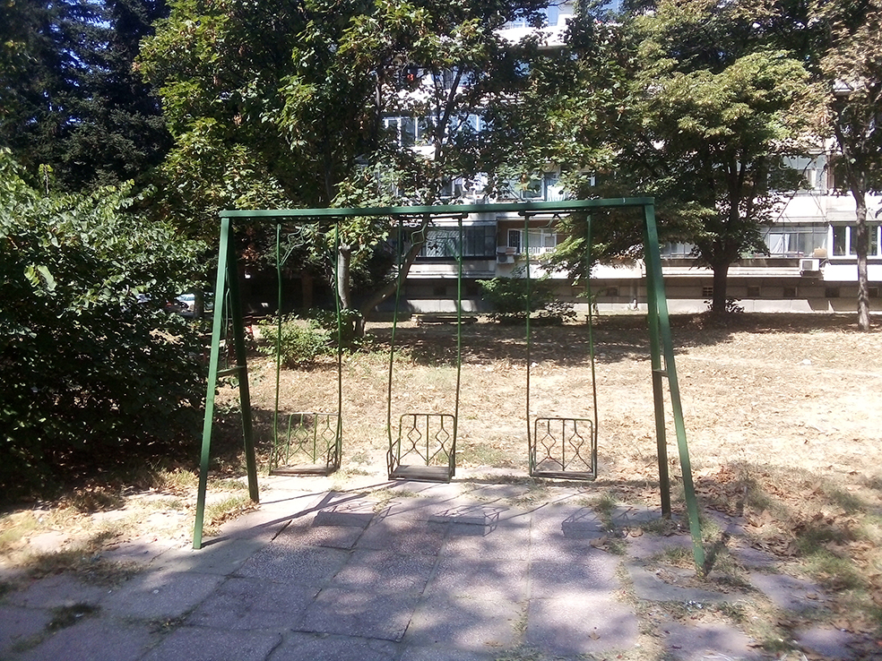 Детската площадка не може да попадне в нито един от стандартите за безопасност. Стърчат ламарини. Деца се нараняват на тях. Люлките са счупени. Едното съоръжение е с огънати железа. Но върхът е пързалката. Болтовете й са изкривени. Пясъчникът е плачевен. Бетоновите му оргадки на много места липсват. Там деца са пукнали главите си. Районът не се поддържа. Кучешки фекалии има на много места. Картинката е ужасяваща.