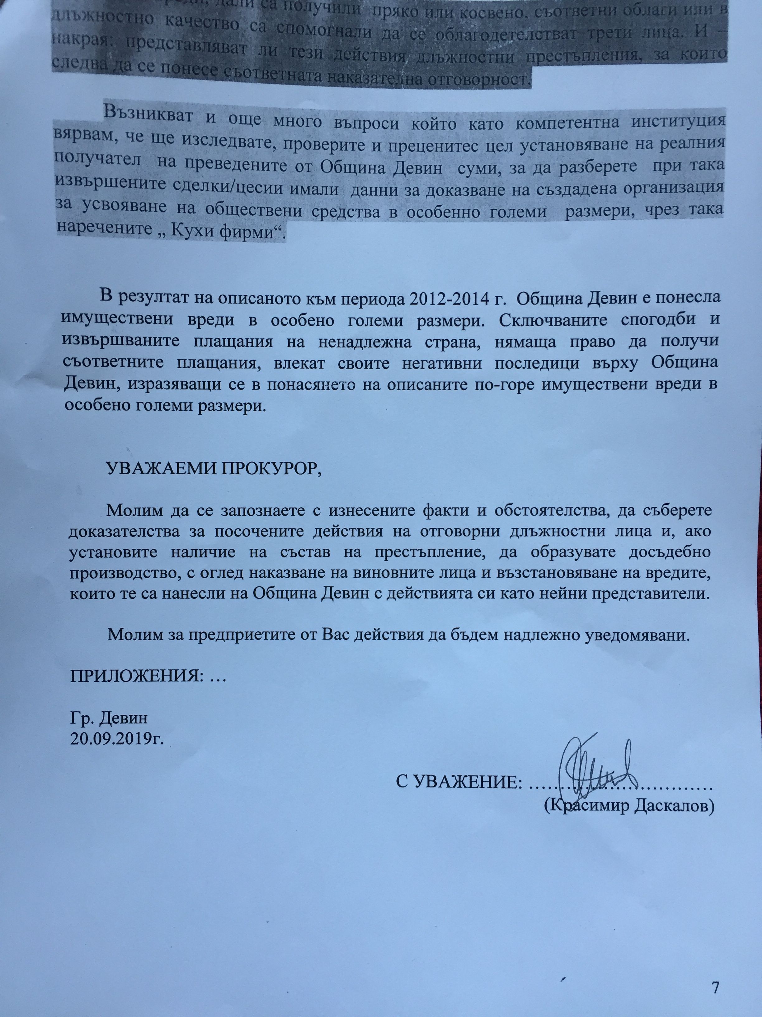 Сегашният кмет на Девин от ГЕРБ Красимир Даскалов, който се състезава за втори мандат, сигнализира прокуратурата за случая касае действия на Цветалин Василев Пенков. Той е кмет на общината в периода 2011-2015 г.. През 2011 г. е кандидат на КП "Обединени за общината". През 2015 г. пък влезе в новините, след като на предишните местни избори се отказа да участва в балотажа, като обвини гражданите, че имал нужда от подкрепа, за да продължи да управлява, но след като не я получил на първи тур, нямало защо да участва на балотажа.