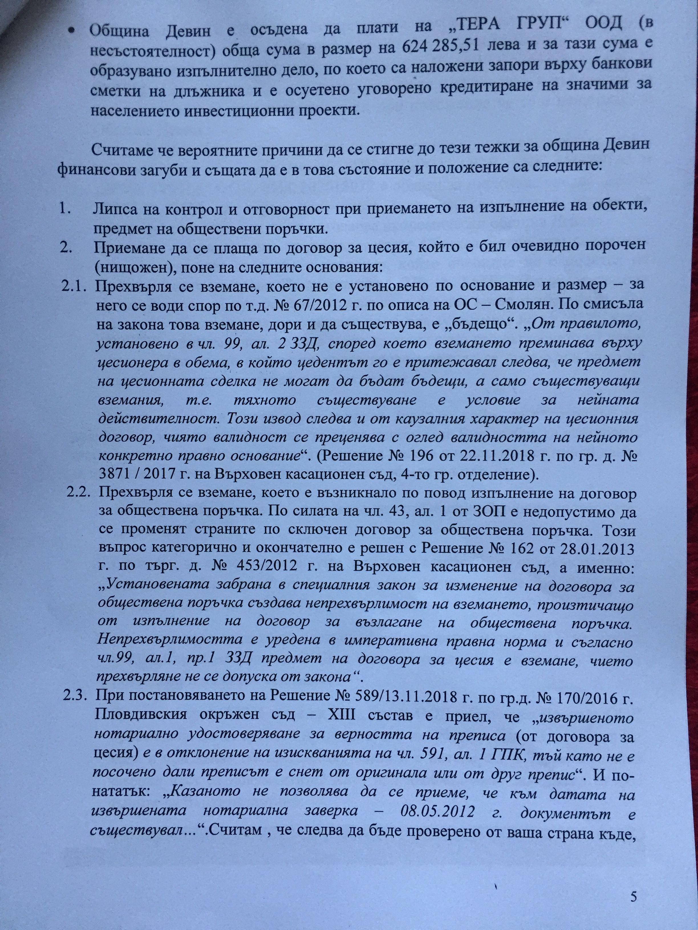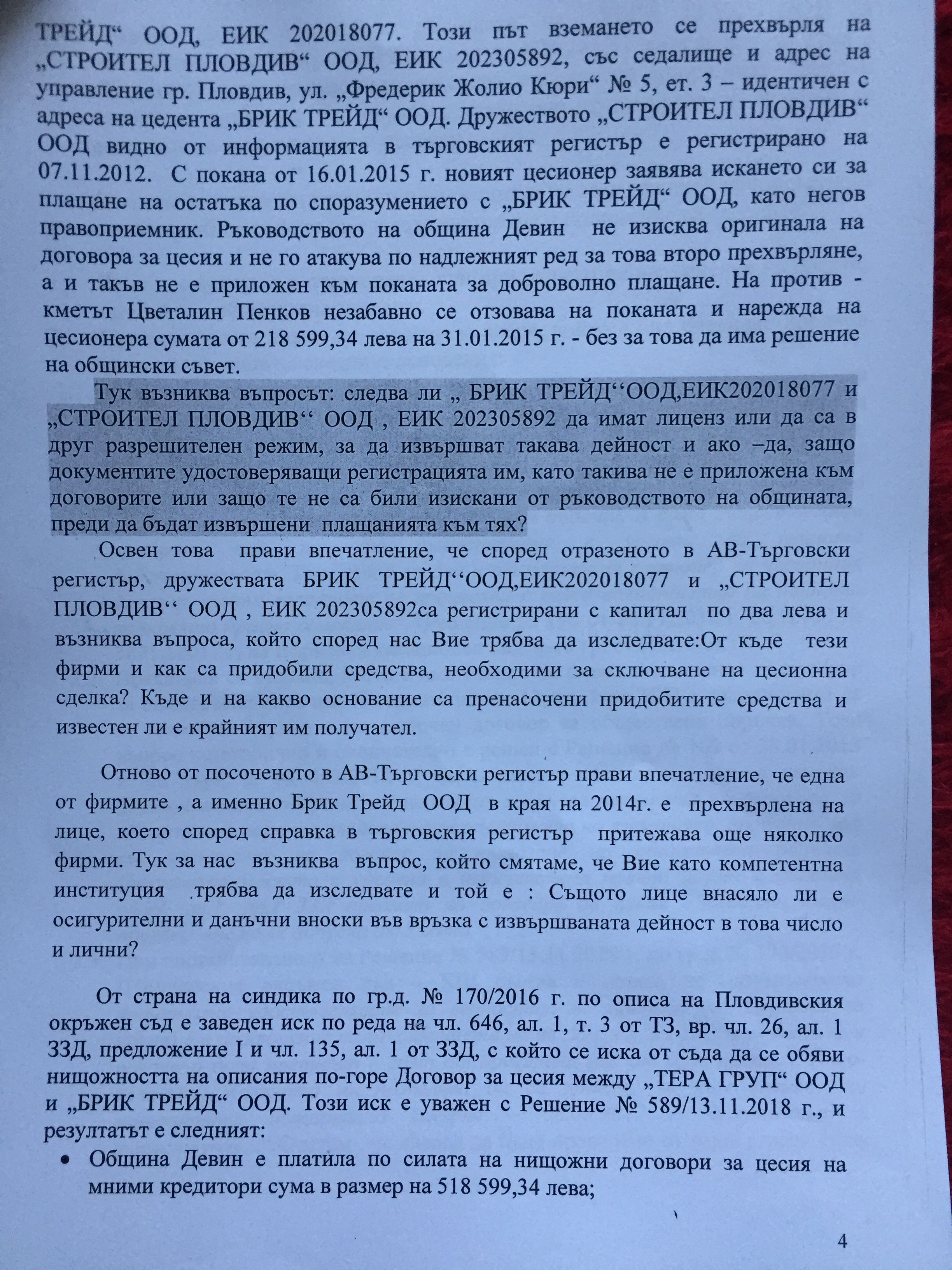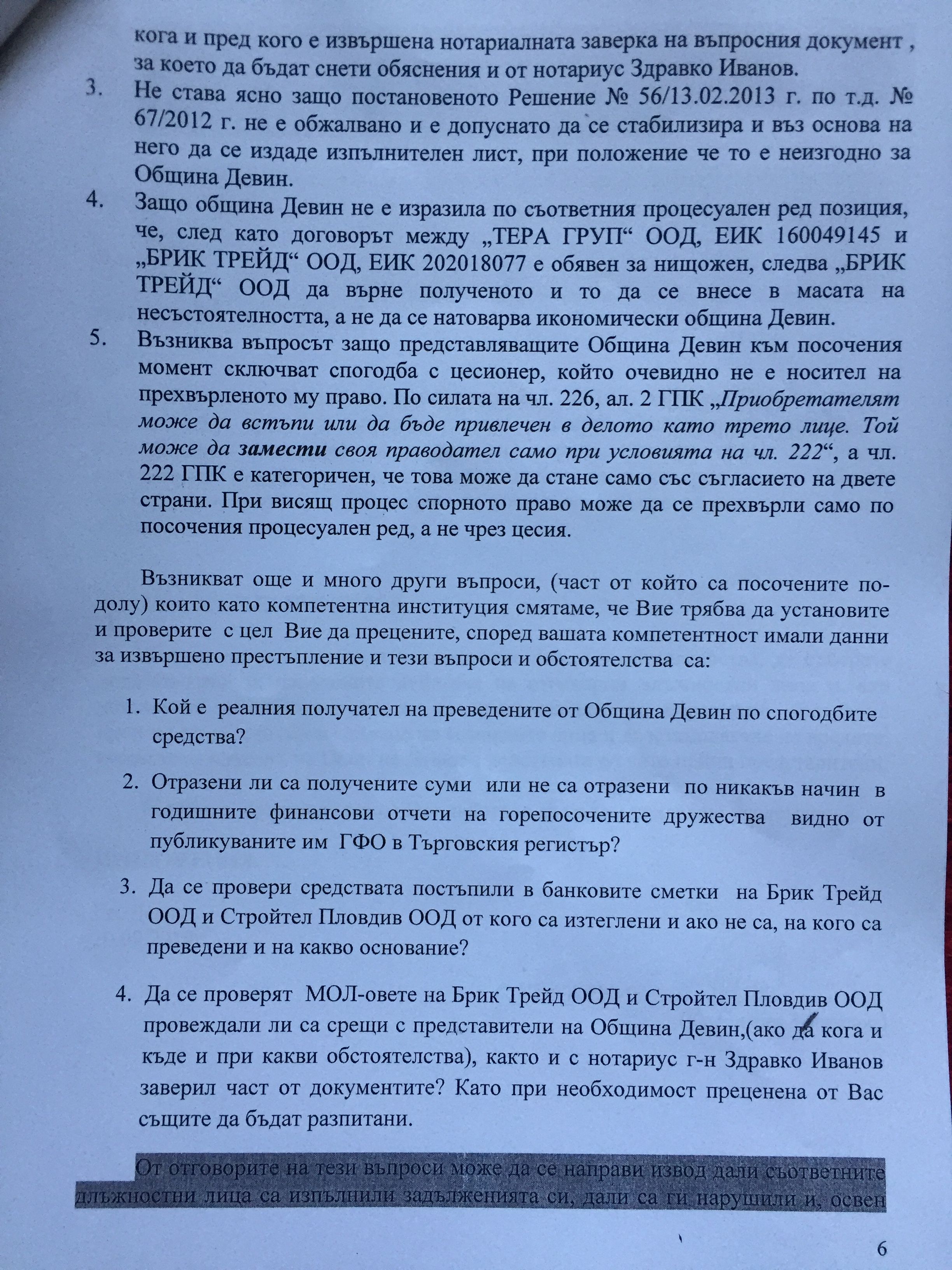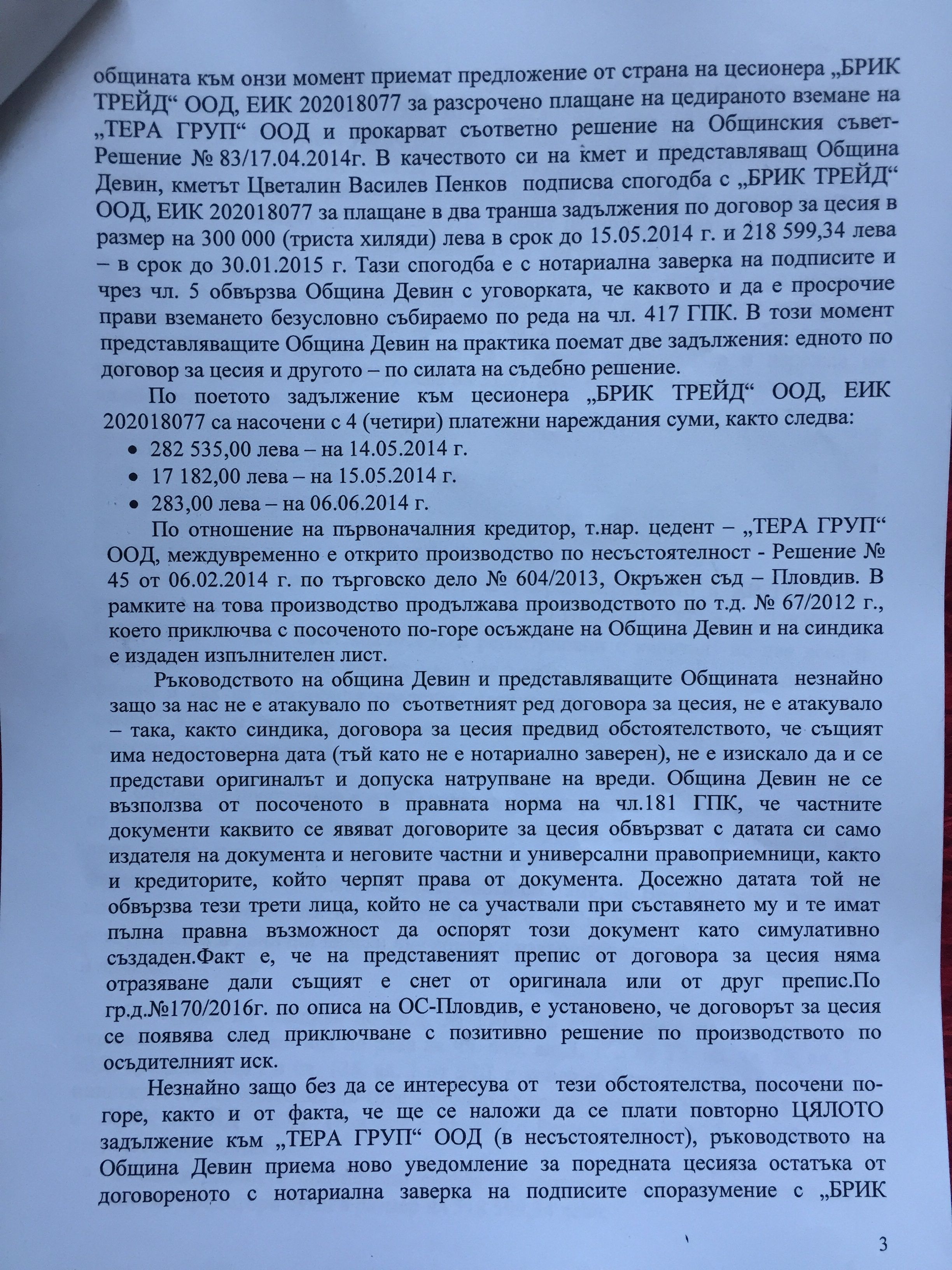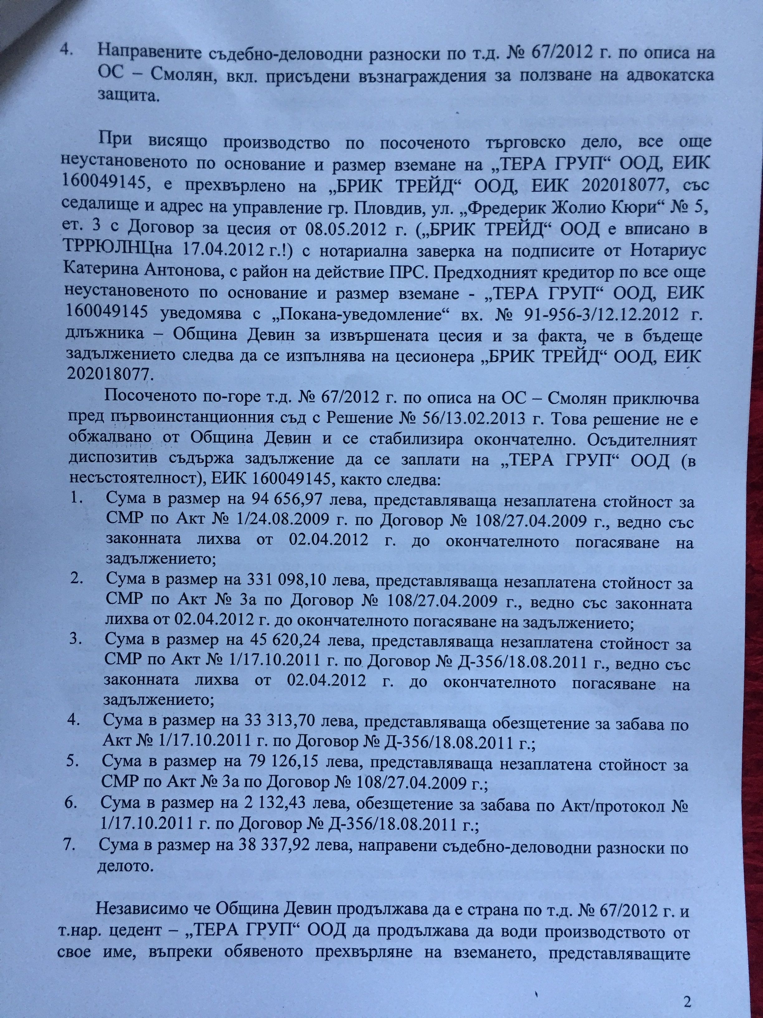 В Окръжния съд в Пловдив е заведено дело от синдик да бъде обявен за нищожен договорът за цесия между "Тера Груп" и "Брик Трейд". Същото е уважено, но Община Девин вече е платила 518 599 лв. Освен това трябва да плати и 624 286, 51 лв. на обявената в несъстоятелност "Тера Груп". За тази сума има изпълнително дело, наложен е и запор на сметките на общината.