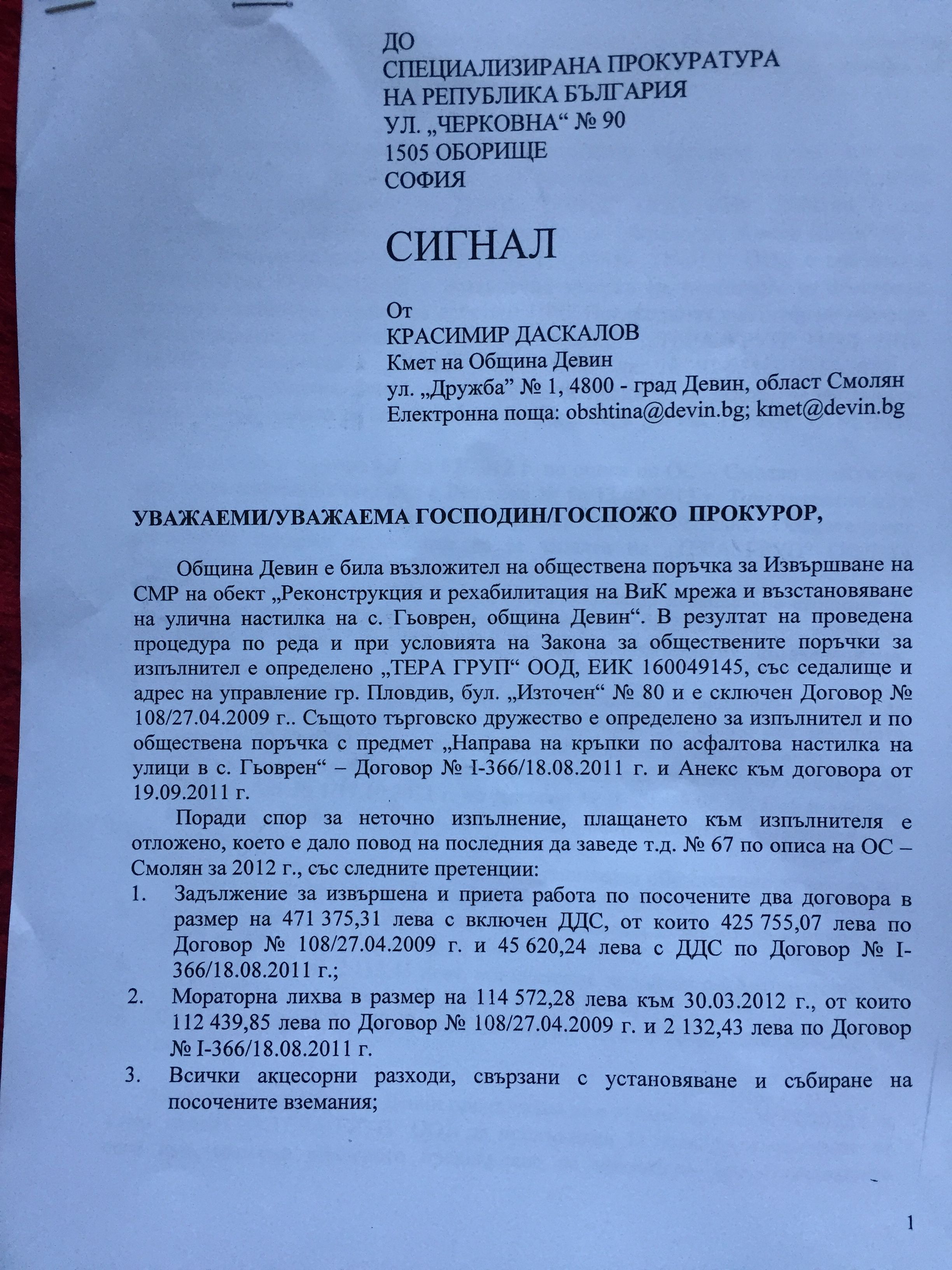 Сигналът на Красимир Даскалов е изпратен до прокуратурата, КПКОНПИ. Но за какво става въпрос - община Девин е била възложител на обществена поръчка за реконструкция и рехабилитация на ВиК мрежата и възстановяването на уличната настилка в село Гьоврен. Печели фирмата от Пловдив "Тера Груп". Същото дружество е определено и да изкърпи асфалтовата настилка в селото.