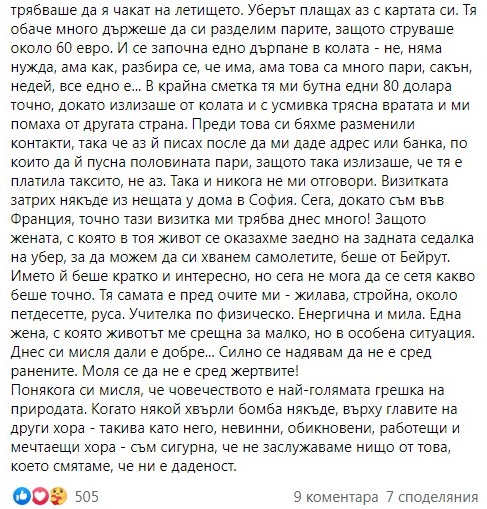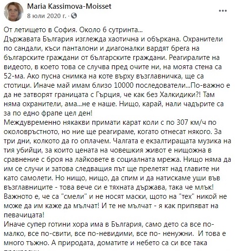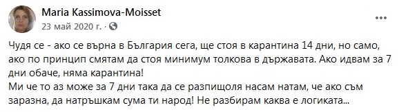 „Всеки месец от тези пет години (от лятото на 2015 г до октомври 2020 г) аз прекарвах в България минимум по две седмици, тъй като работата ми е била винаги тук. Уточнявам: всеки месец по две седмици. Тук са децата ми, малкото ми останали роднини, тук плащам осигуровките си. Не съм изпускала нищо от обществения, културния и политическия живот.“