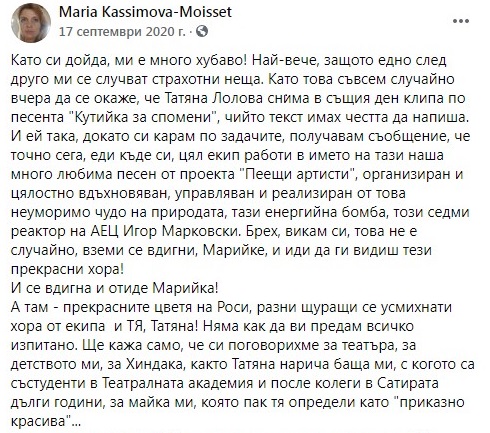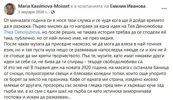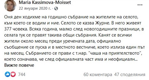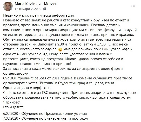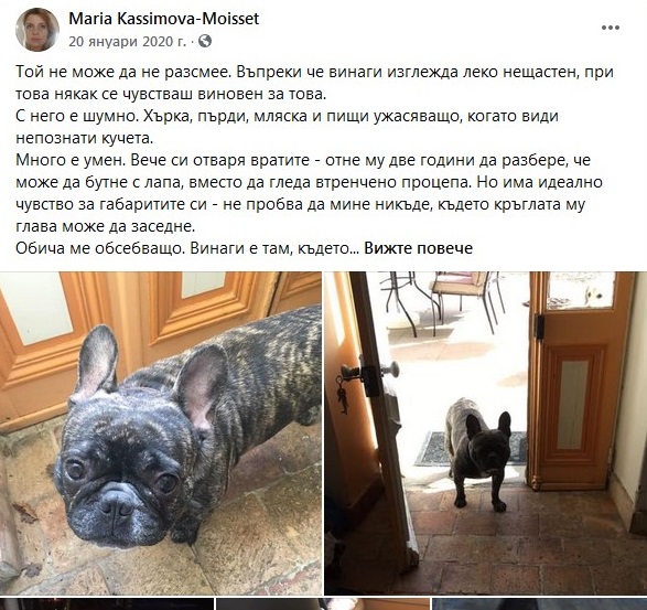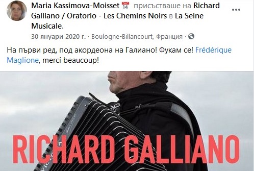 2. За целият януари 2020 г-жа Моасе, която по собствените й думи „има логорея“, не пропуска да поства редовно във ФБ, но никой от постовете не намеква за присъствие в България. Напротив – имаме пост от 12.01 (снимка М02), в който рекламира следващите си платени ангажименти в България; пост от 20.01 (снимка М03) със снимки от гореспоменатото хъркащо куче; пост от 22.01 (снимка М04), в който разказва за участието си в селското събрание на с. Журне (в което, по собствените й думи, участват ЖИТЕЛИТЕ на селото); пост от 30.01 (снимка М05), видно от който е на концерт на Ришар Галиано в Париж.