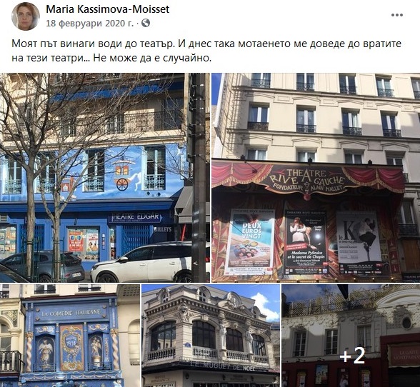3. За февруари 2020 знаем, че г-жа Моасе е пристигнала в началото на месеца в България, където е имало няколко платени ангажимента и се е прибрала на 18.02 във Франция, като същият ден е обикаляла из Париж и е снимала малки местни театри (снимка М06).